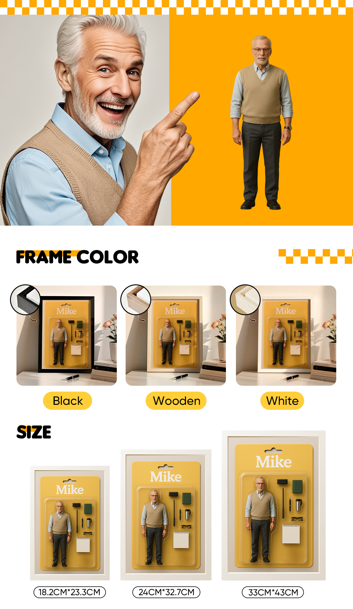 Turn your loved ones into one-of-a-kind collectible figures with this fully customizable Mini Figure Picture Frame. This eye-catching piece features a lifelike mini figure based on your photo and comes with signature accessories to showcase your personality, hobbies, or everyday essentials—from notebooks and mugs to glasses and pens.