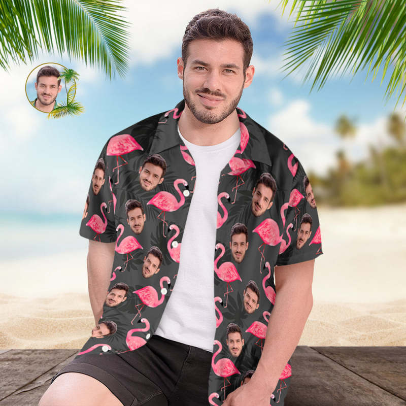 Custom Face Hawaiian Shirt For Him Personalized Men's Photo Shirt Flamingo & Monstera Leaves Valentine's Day Gift