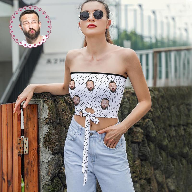 Custom Face on Women's Strapless Bow Tube Top Personalized Breast Wrap Bikini Tops with Photo Family Photo Go to Beach Perfect Gift for Wife - Black and White Stripes