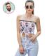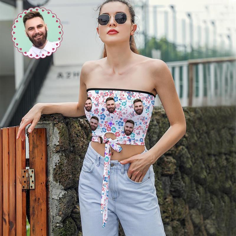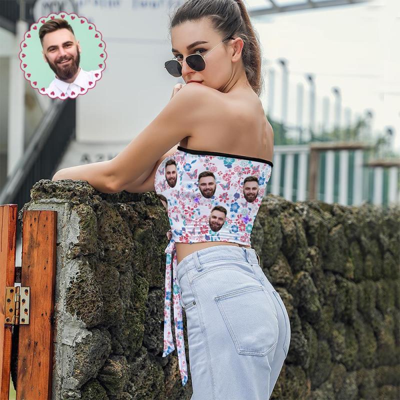 Custom Face on Women's Strapless Bow Tube Top Personalized Breast Wrap Bikini Tops with Photo Family Photo Go to Beach Perfect Gift for Wife - Butterflies and Flowers