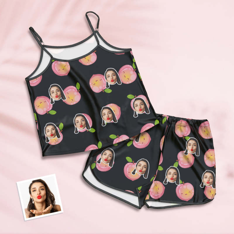 Custom Face Pajamas Suspender Sleepcoat Shorts Lingerie Set Summer Sleepwear - Peach
