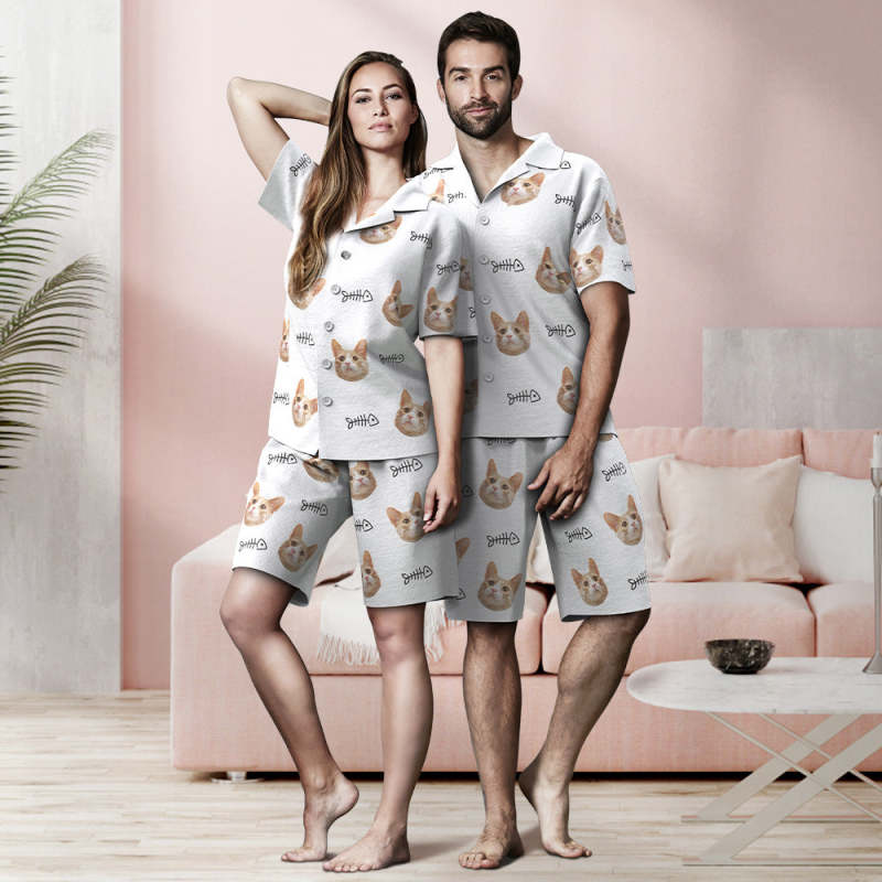 Custom Face Short Sleeved Pajamas Personalized Cat Sleepwear With Fish Women Men Pajamas