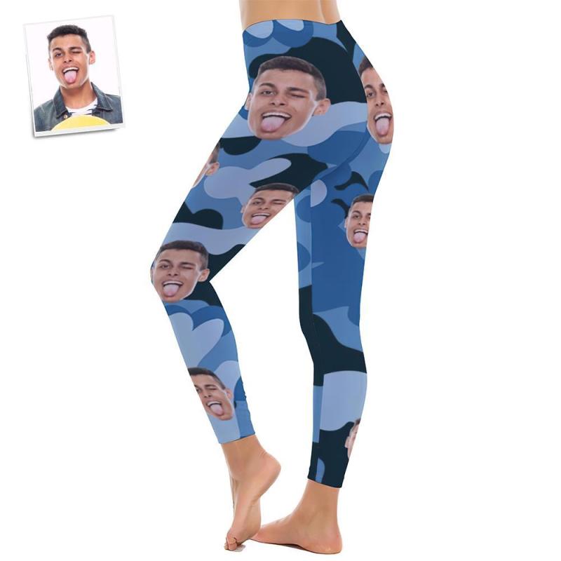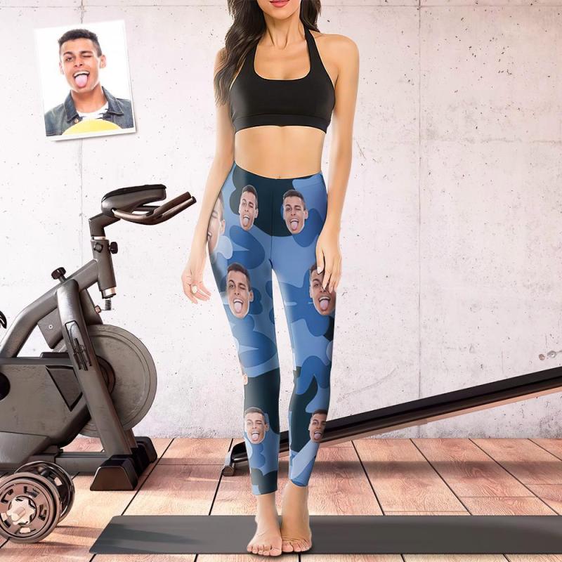 Custom Face Women's Yoga pants Personalied Photo Yoga Leggings - Light Sky Blue Camouflage