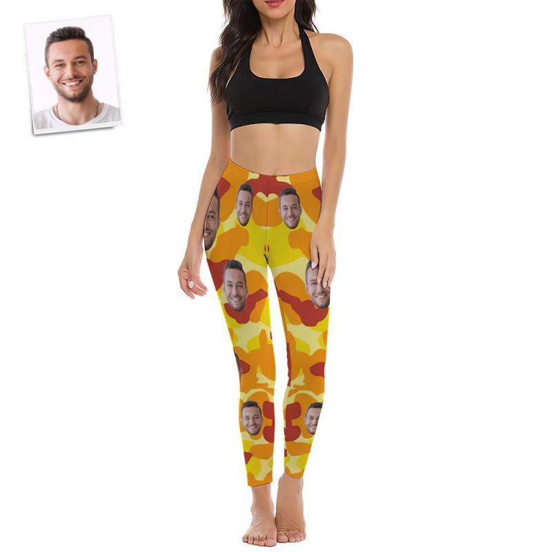 Custom Face Women's Yoga pants Personalied Photo Yoga Leggings - Orange Camouflage