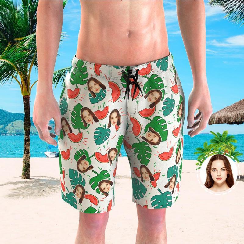 Men's Custom Face Beach Trunks Personalize Beach Shorts with Photos - Watermelon and Leaves